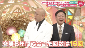 恋のキューピッドは共通の知人。4年前、当時31歳だった妻は結婚願望が沸点に達し、いい人がいたら紹介してほしいと世話好きな知人であるイベンターのおじさんに懇願。候補に挙げられたのが夫だった。実は妻、以前その知人が主催する野外イベントで夫と一度会っていた。ダンサーとして参加していた妻は、屋台を出店していた夫を見て、「LDH系の怖そうな人」という印象を抱いていたという。その話を聞き「確かに一緒に踊ってそう!」と食いついたMC藤井隆。スタジオで夫にダンスの無茶ブリをすると、夫が披露したダンスでスタジオは爆笑の渦に。