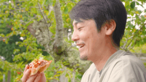ようやく頂上に到着、いつもよりハードな登山の後はお待ちかねの「頂きメシ」の時間です。今回用意したのは、紀州名産の梅を使ったその名も「梅うどん」。地元産の椎茸とネギ、梅干し、ボリジ(食用花)を使って三船流にアレンジ!いい汗をかいた体に梅の酸っぱさが心地よく、癒される〜って感じです。