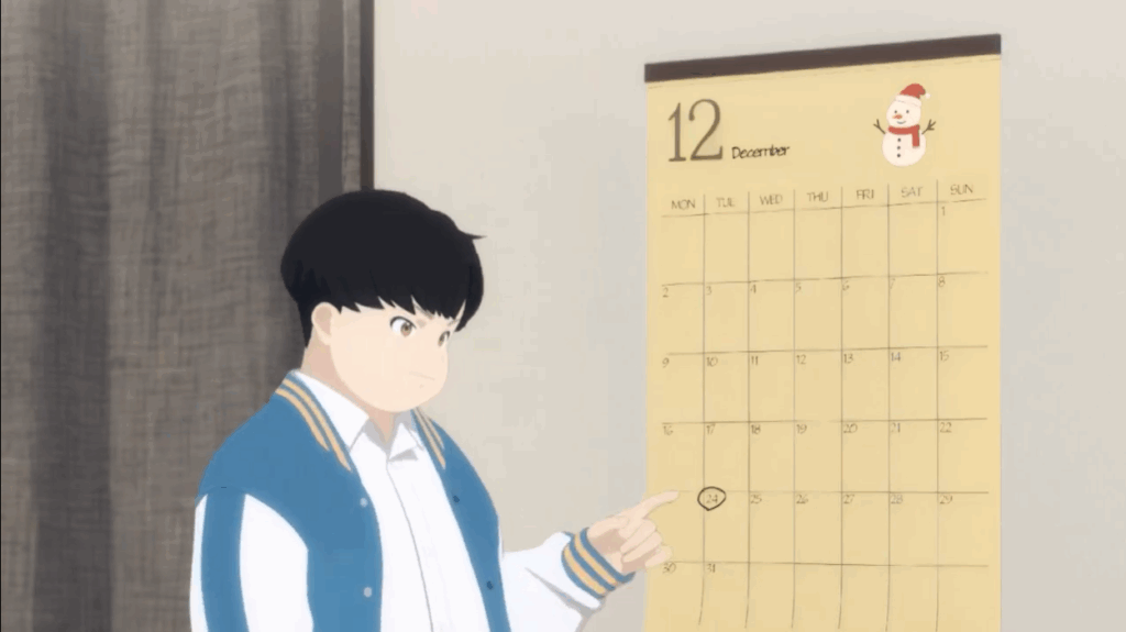 月乃がフラれてからちょうど1年後のクリスマスイブを決行日に定めた祐樹は、「早速ランニングだぁ~!」と家を出る。