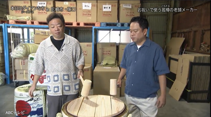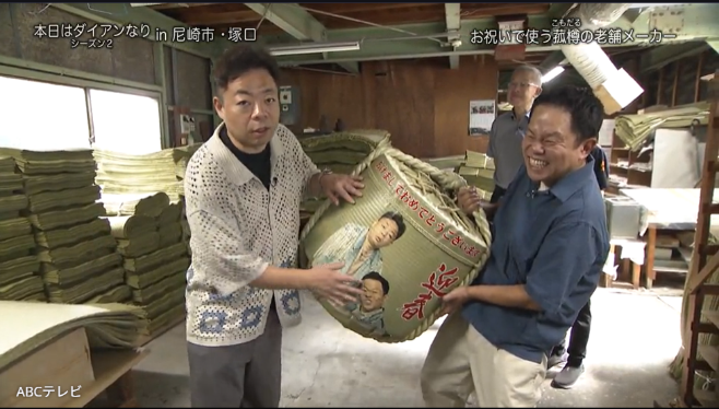 阪急塚口駅から徒歩圏内にある、鏡開きなどで使用するお祝い樽の菰樽(こもだる)を作っている創業125年の老舗メーカーを訪れたダイアン。酒蔵が多い灘や伊丹に近い尼崎では菰樽作りが盛んだったとのこと。