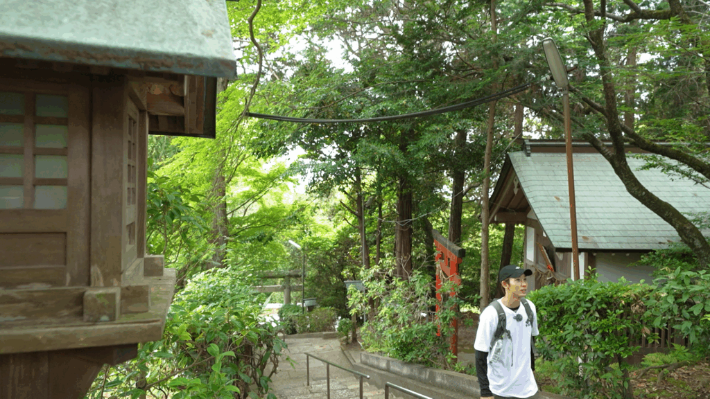 次第に舗装がなくなり山道らしい山道に入って、次に向かうのは愛宕神社。火の神様を祀る神社だそうで、最近、料理に目覚めたという近藤さん、火難避けのためのお参りに立ち寄ります。この五月山では毎年夏になると伝統行事の「がんがら火祭り」が催され、松明が池田の街を練り歩き、山には「大一」と「大」の文字の形に火が灯されます。「がんがら」とは松明が街を練り歩く際に打ち鳴らされる八丁鉦という鐘の響きのことだとされています。