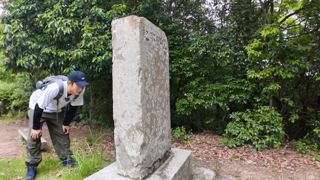 整備されているコースは全部で5つ。今回は、距離は短いながら傾斜が急な、登り応えのある「望海亭コース」に挑戦することに。阪急池田駅から商店街を抜けると登山口へと続く道が見えてきます。ほどなくして始まった登山道はまず、階段から。15分も歩くと旧望海亭跡に到着です。今でこそ木々にまわりを囲まれて眺望はありませんが、室町時代には禅修行のための建物があり、かつては大阪湾まで広く望むことができたといわれています。それが「望海亭」の名前の由来なんだとか。その跡地に残る碑には天保12年(西暦1841年)の文字が刻まれていました。
