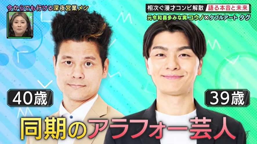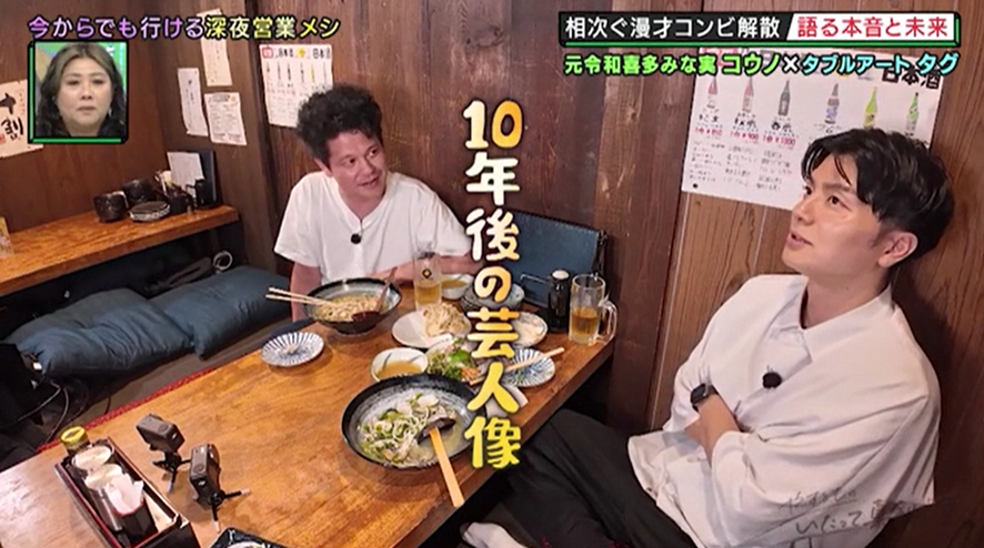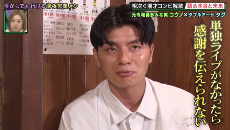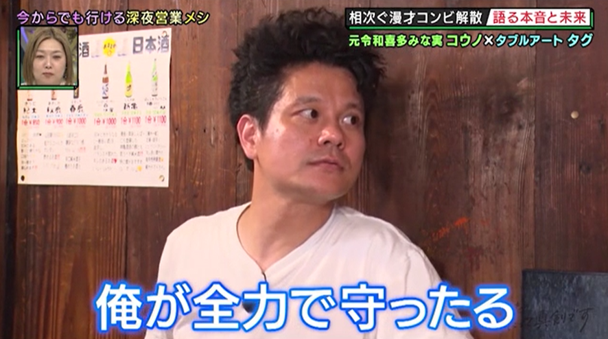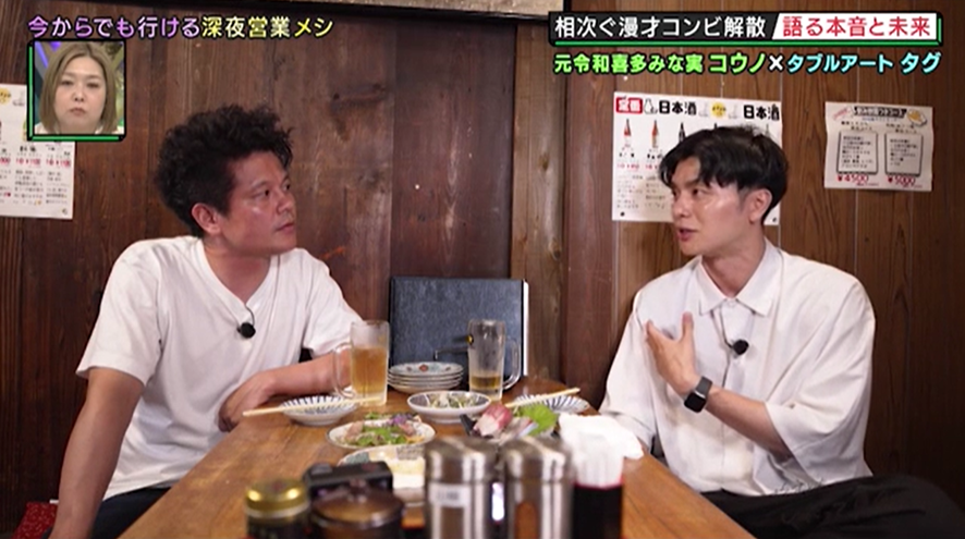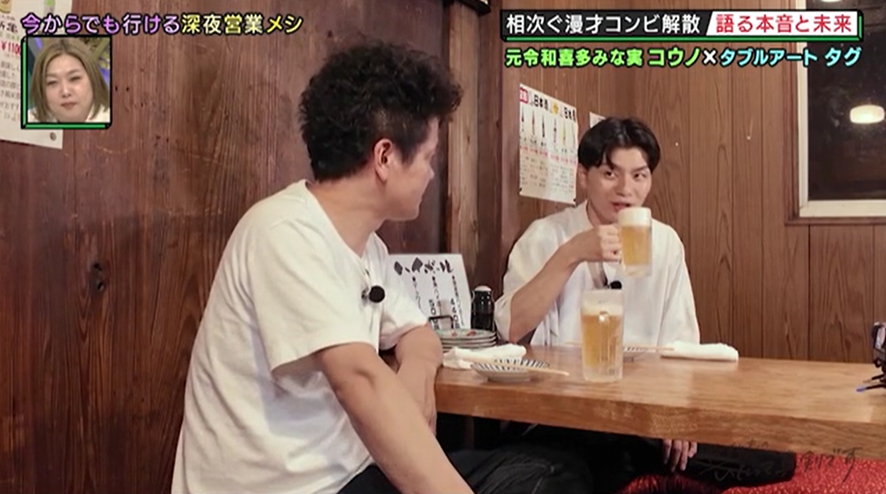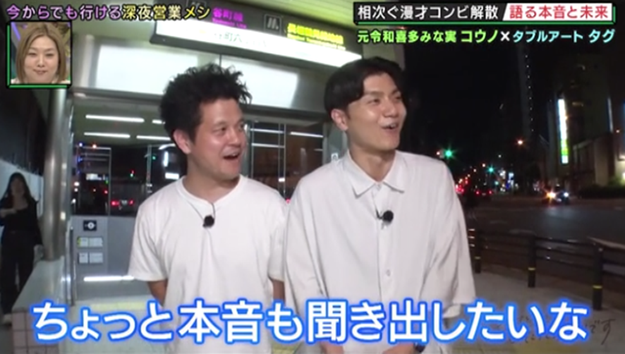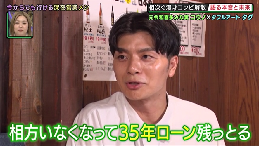 ちなみにコウノといえば、2023年に自宅マンションを購入したばかり。「ホンマに買いたかったし、息子が小学校に上がる前には……」と考えていた彼は、当初は当然「1人になると思っていなかった」ため、「今となってはすごい怖い。相方がいなくなって35年のローンだけ残っている」と苦笑い。そんなコウノをタグは、「俺が全力で守ったる。俺が(相方の)真べぇに相談する。お前、何かあったらダブルアート入れ!」と慰めた。