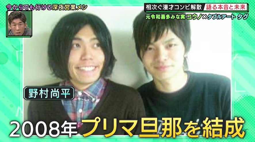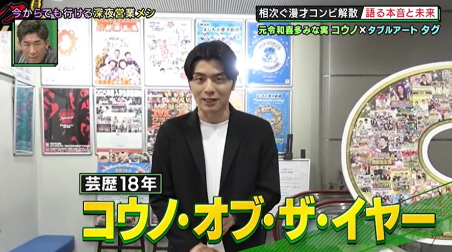 ⼈⽣が激変中のピン芸人とは、39歳の河野良祐改めコウノ・オブ・ザ・イヤーのこと。かつてコウノは、相方の野村尚平とお笑いコンビ「プリマ旦那」を結成し、2009年に漫才頂上決戦『M-1グランプリ』で準決勝に進出して以来、さまざまな賞レースに名を連ねた。