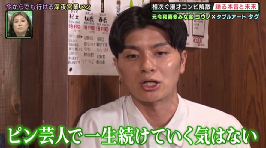 対して、8月に河野良祐から改名したコウノは、ピン芸人として活動中。彼いわく、「別に今後ピン芸人で一生続けていく気はなくて。誰かと何かをしたいという気持ちもある」そうだ。