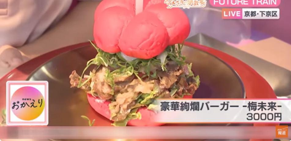さっそく試食する大仁田アナは、梅の花のような赤いバンズにすき焼きをたっぷりサンドしたハンバーガーや、ピンクの五重塔がそびえ立つボリューム満点パフェなどを堪能。そのおいしさと“映え”必至のキュートさに大満足の様子でした。