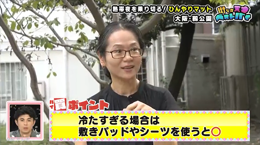靭公園にいた女性会社員のベストバイは、サンコーのひんやり水流快眠マット。電源を入れると、マット全体に水が流れて循環し、冷感を一晩中持続させます。このマットの1時間当たりの電気代は、わずか0.2円だそう! 彼女いわく、「エアコンを使うと喉が枯れるので、これを試したらエアコンがいらなくなりました」とのことです。