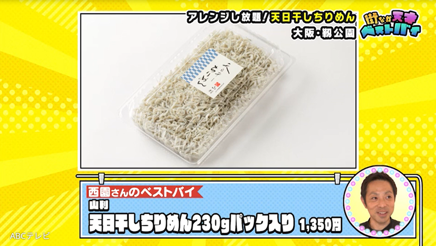 Seiichiro,NISHIZONOのオーナーシェフのベストバイは、和歌山県で160年以上続くしらすの老舗・山利の天日干しちりめん。硬すぎず、ほどよく軟らかな食感が特徴です。「ごはんにかけて食べるだけでも十分おいしい」そうですが、おにぎりやオイル系パスタの具材にしても絶品! 実はオーナーパティシエは、このしらすを使った塩味のサブレのプロデュースもしています。