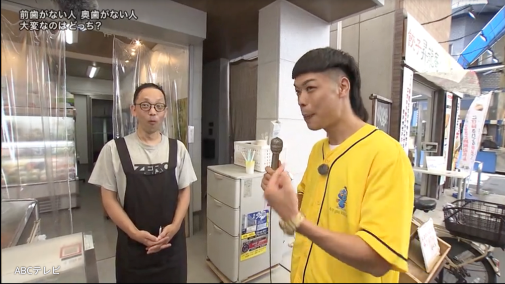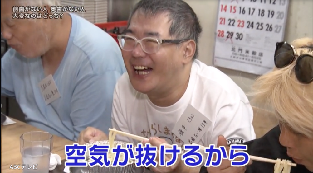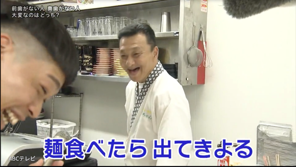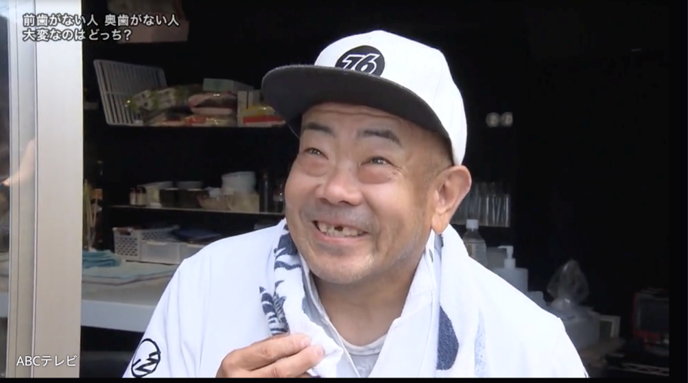 上の歯が全部ないという飲食店の男性は「麺食べたら出てきよる」とのこと。