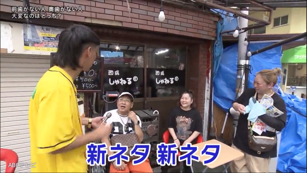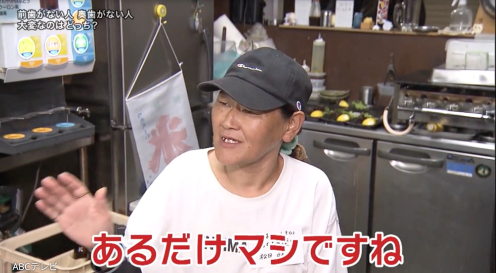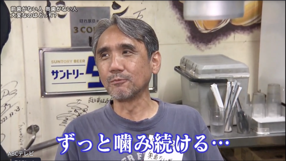 奥歯のない男性は、食事中に「よう舌を噛む」と証言すると、お仲間の奥歯のない女性も同意した。奥歯のない人あるあるらしい。