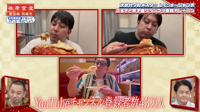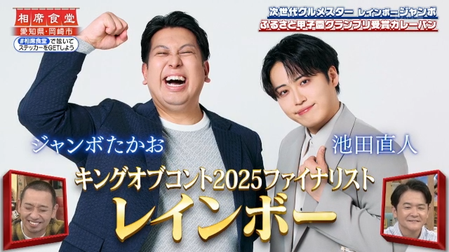 『相席食堂』に出演したのは、コント芸日本一を決める『キングオブコント2025』ファイナリスト・レインボーのジャンボたかお。身長が183センチ、体重が129キロの、自称「吉本の飯⾷いモンスター」だ。たかおは、食事をしているだけのYouTube動画が⼈気で、そのチャンネル登録者数はなんと40万⼈超え! タレントの彦摩呂や⽯塚英彦に続く、次世代グルメスター候補と言える。