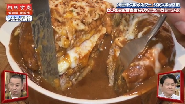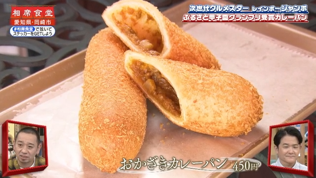 「カレーが⼀番の⼤好物」というたかおは、新ご当地グルメ・おかざきカレーパンを推している愛知県岡崎市へ。地元民おすすめのベーカリーでは、「ふるさと甲子園」グランプリ受賞商品を味わい、人気オムライス店では、平焼きチーズカレーパンのほかに名物オムライスを2皿も食べた。