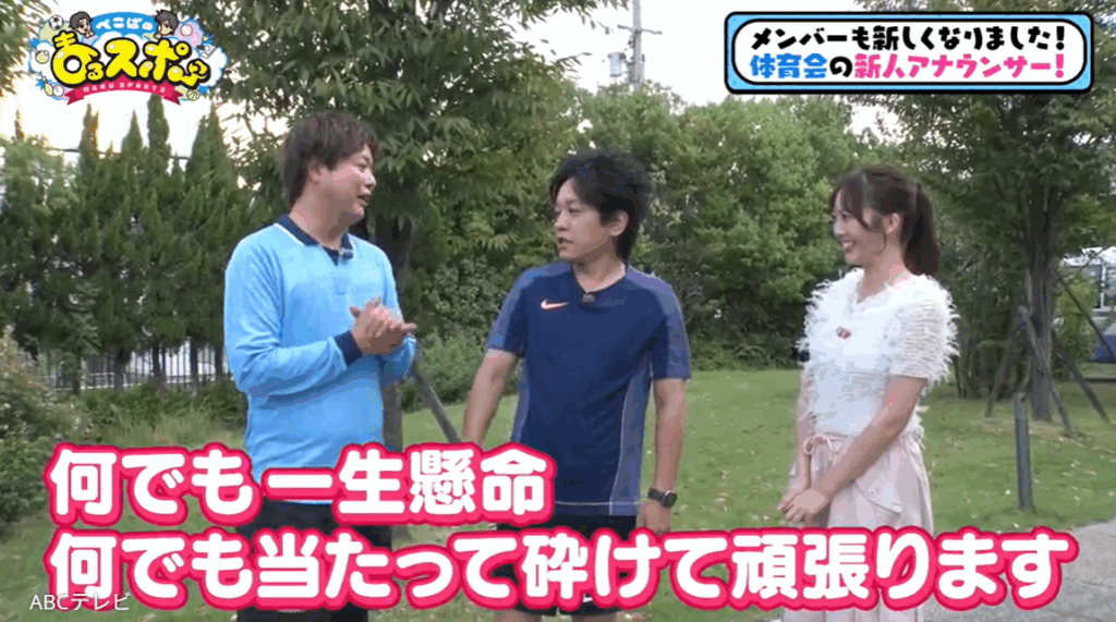そんな期待の新人・新貝アナが、リニューアルしたスポーツバラエティ番組『ぺこぱのまるスポ』(ABCテレビ)のアシスタントを初担当! 「大学では、体育会水上スキー部に所属していました!」「なんでも一生懸命、なんでも当たって砕けてで頑張りたいと思います!」と、フレッシュな笑顔で自己紹介した。