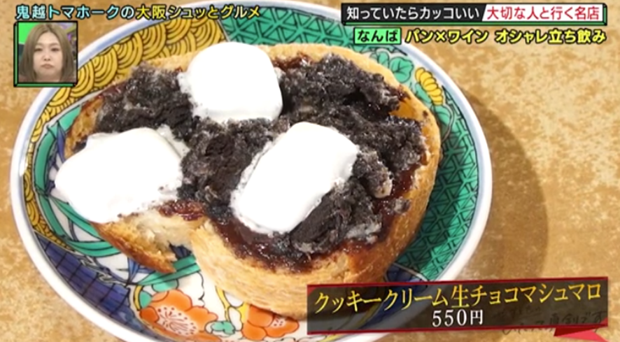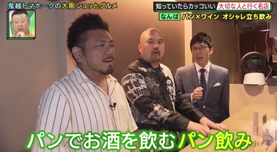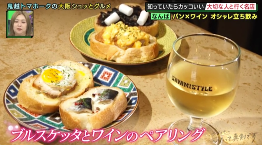 2軒目は、裏なんばのお店。カフェかスイーツ店のような外観だが、実はこちら、昨年オープンした話題の立ち飲み屋さん。パンにさまざまな具をのせた軽食「ブルスケッタ」をアテにお酒を飲む「パン飲み」が楽しめるという。甘いスイーツ系のブルスケッタにスッキリした苦味のハイボールを合わせるなど、極上のマッチングに鬼越の2人も「合うわ〜」「うまっ!」とどハマり!