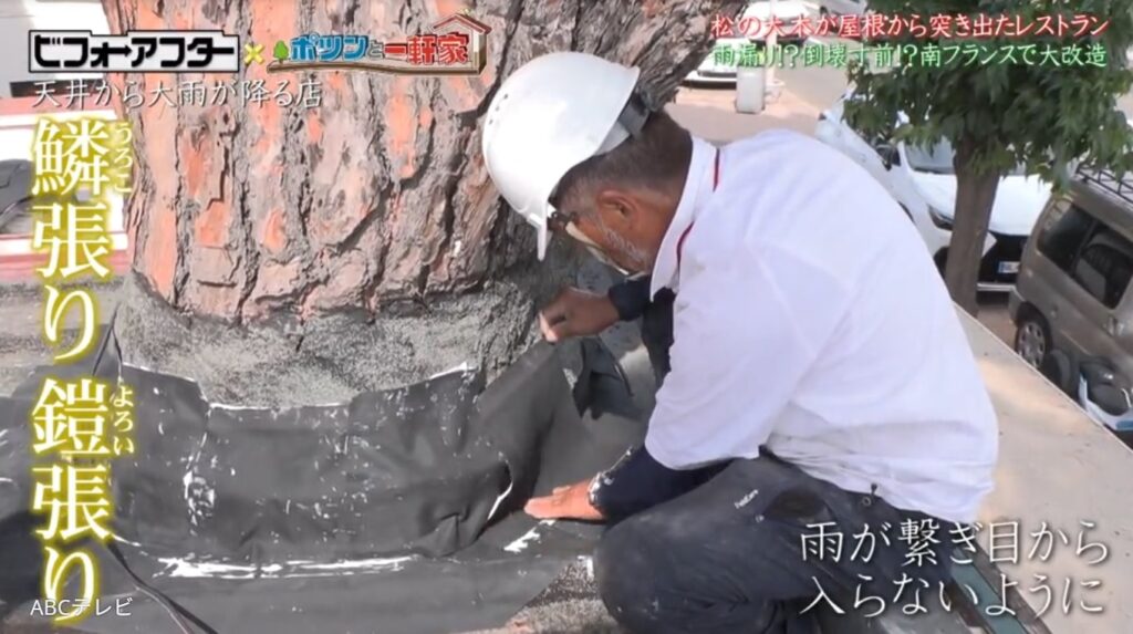 次は屋根の雨漏り対策。ゴムシートを菱形に切り分け、日本の伝統技法である「鎧張り(鱗張り)」で重ねて貼り付けるという独自の工法で防水処理を施した。これにより、今後の松の成長や強い風による揺れにも柔軟に対応できるようになり、長期的な雨漏りの問題に終止符が打たれることに。