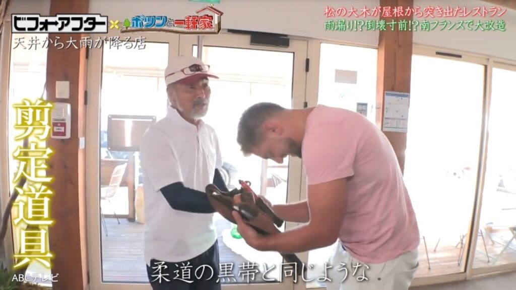 工事期間はわずか1週間。匠は、柔道の元フランスチャンピオンだという地元公務店の社長率いる職人チームと協働することに。まずとりかかったのは、安全確保。倒壊寸前だった梁を切断し、新たな柱で補強。幹と壁の接触部分が取り除かれ、木にも「解放感」がもたらされた。