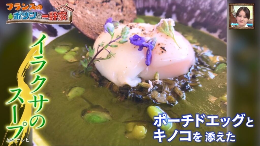 シェフの料理は、「ハーブやキノコなど、山で取れる自然の食材を存分に生かす」のが特徴。山で食材をみつけ、それらに合わせて、コース料理を提供する。昔から看板メニューとなっているイラクサのスープの材料となるイラクサも、山で取っているのだそう。