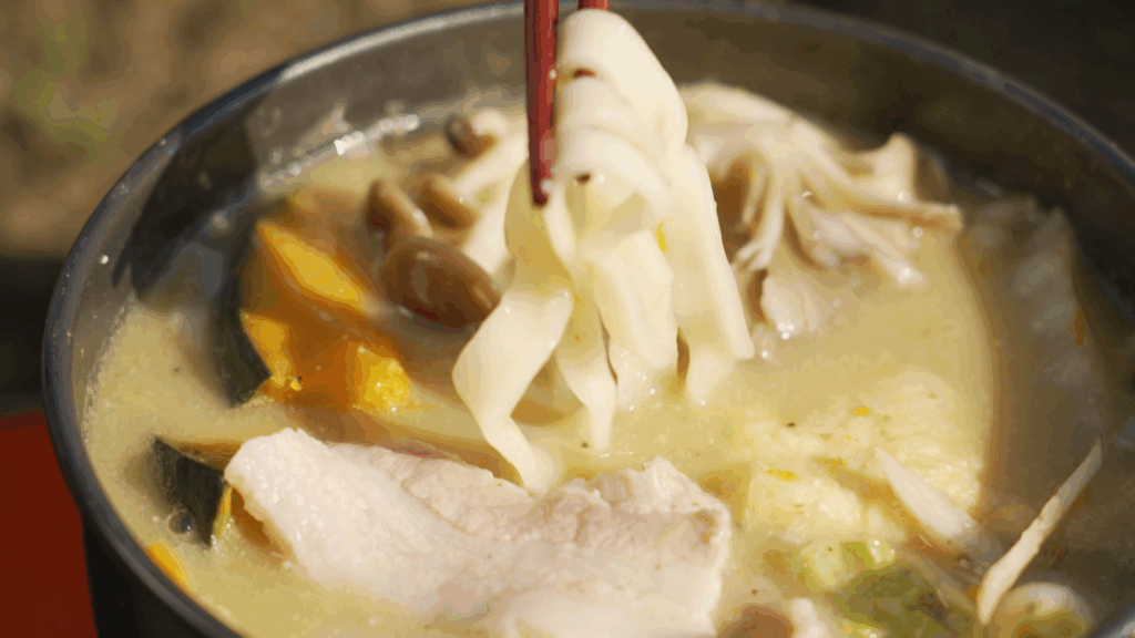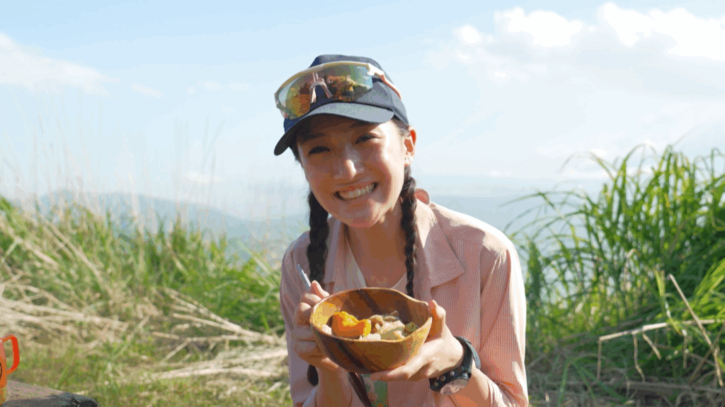 今回の頂きメシは山梨名物「ほうとう」。このために調理器具を背負ってきた野口さん、さっそく調理開始です。用意したのは「黄金ほうとう」。郷土料理の大会「ほうとう味比べ大会」で3連覇した名品で、野菜から肉、麺、隠し味に鮑の肝を使ったスープの素まで、全ての材料がセットになっていて、鍋で煮込むだけで名店の味が楽しめる逸品です。これぞ山のご飯、「頂きメシ、いただきます!」