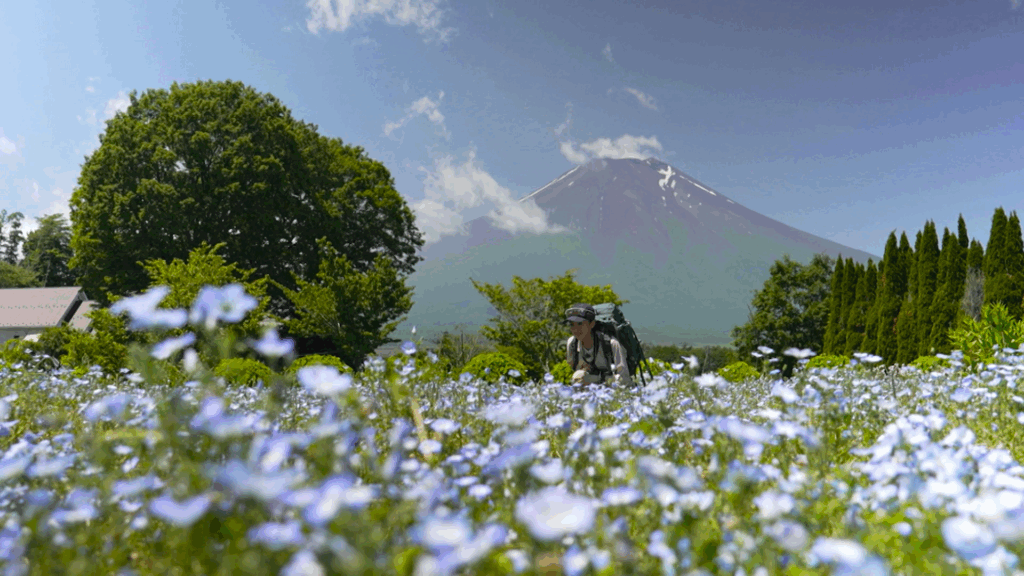 まずは、花の都公園のバス停から公園の中を歩いて登山口へと向かいます。この時点ですでに均整の取れた美しい富士山の姿が見えています。撮影の時期(6月中旬)はネモフィラがちょうど見頃を迎え、澄んだ青い色の花が絨毯を敷き詰めたように一面に広がっています。最近、写真撮影にハマっているという野口さん、さっそく持参したカメラでパチリ。今回の登山は富士山の写真を撮るのも目的の一つだとのこと。どんな写真が撮れるか、楽しみですね。
