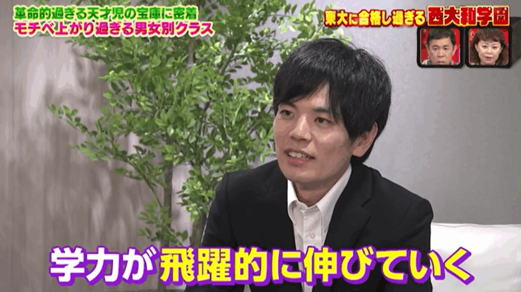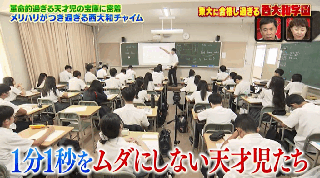 2つ目は、「モチベーションが上がり過ぎる男⼥別クラス」。⻄⼤和学園は、有名進学校でありながら共学校だが、実は中学2年生までは男⼥別のクラスに分かれている。学年部長を務める教師いわく、男女別から共同にするこのシステムによって、「新しい気持ちで勉強をスタートすることができるので、学力が飛躍的に伸びていく」のだとか。