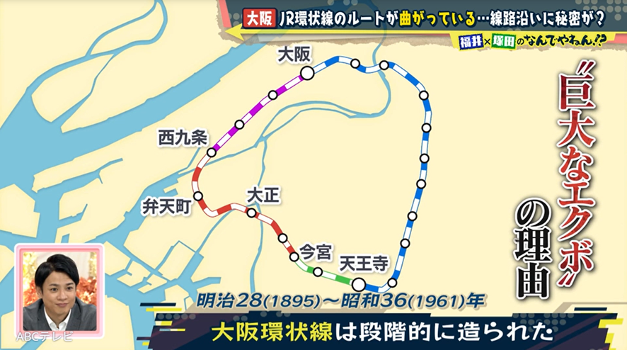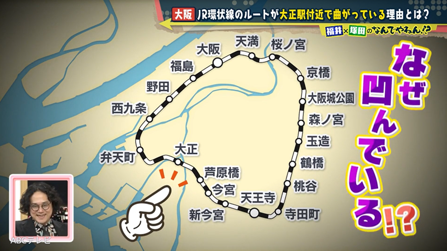 JR大阪環状線の弁天町駅から今宮駅のルートは、なぜか大正駅付近で内側に曲がっている。曲がってできた凹み部分は、巨大なエクボのようだ。JR大阪環状線がなぜこのルートになったのか? “巨大エクボ”の謎を、A.B.C-Zの塚田僚一とABCテレビの福井治人アナウンサーが調査した。