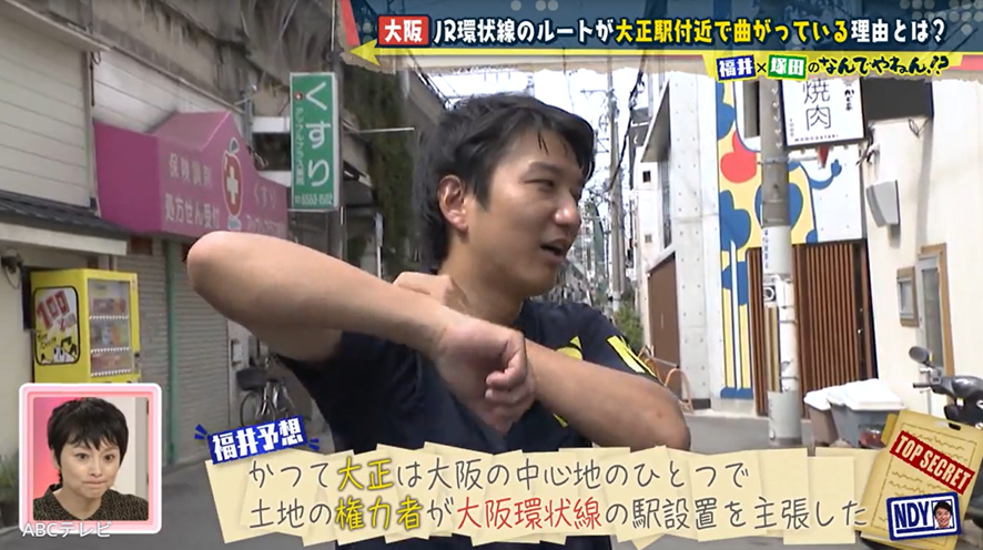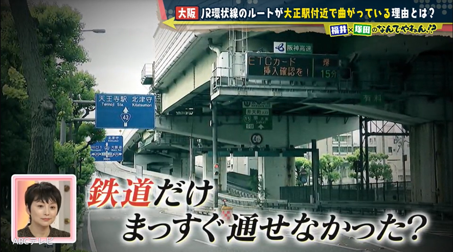 環状線の弁天町駅のそばには、平行するように阪神高速道路と国道43号が通っている。どれも天王寺方面に向かっているが、途中でグニャリと曲がっているのは線路だけだ。しかし、線路が何かを迂回するために曲がっている様子は全くない。そのため塚田と福井アナは、「大正に(線路を)通したかった何かがある」と考え、大正駅方面へ向かった。