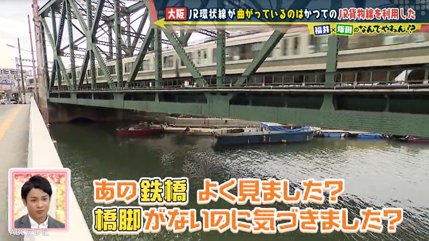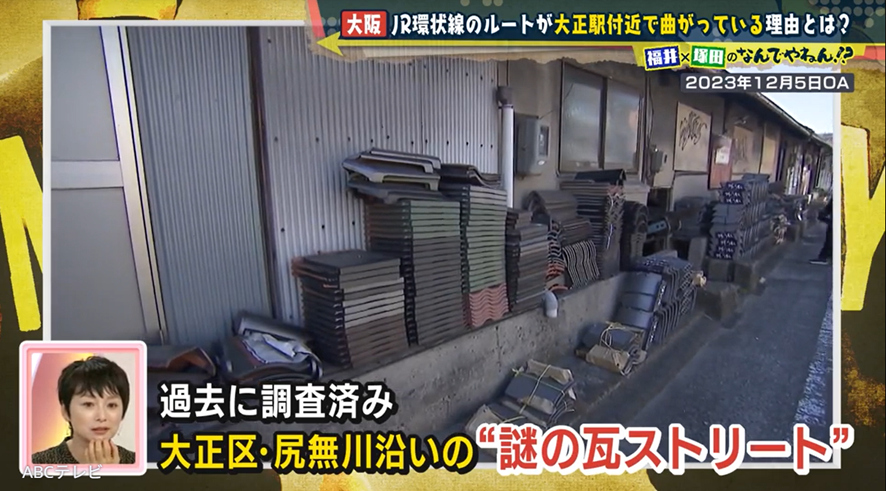 大正駅付近を流れる尻無川にやってきた塚田と福井アナは、鉄橋付近で謎の記念碑を発見。昭和3(1928)年にこの地に鉄道が通り、その下をくぐる道が開通したことを知った。実は尻無川沿いには、昔から瓦を扱う商店が多い。塚田の「瓦ってことはお屋敷?」という発言や、記念碑に記された「工事費寄附者」という文字も含め、福井アナは「かつて大正は大阪の中心地の1つで、土地の権力者が大阪環状線の駅設置を主張した」と予想した。