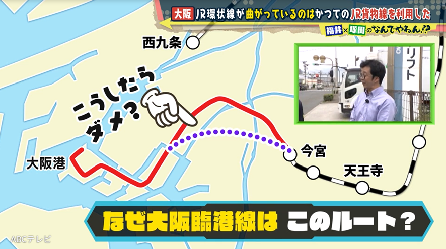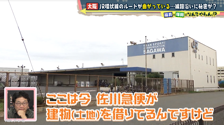 伊原さんが塚田と福井アナにたどり着いてほしかったのは、廃線の延長線上を大阪港方面へ約800メートル歩いたところにある佐川急便。佐川急便の建物には、「JR貨物」と書かれている。つまり廃線跡は、JRの貨物線だったのだ。この貨物線は、2006年まで大阪の物流を支えた「大阪臨港線」。大阪環状線が昭和36年に西九条駅と今宮駅間を結んだときに、コスト面の考慮から大阪臨港線のルートを利用したため、“巨大エクボ”が出来上がったというわけだった。