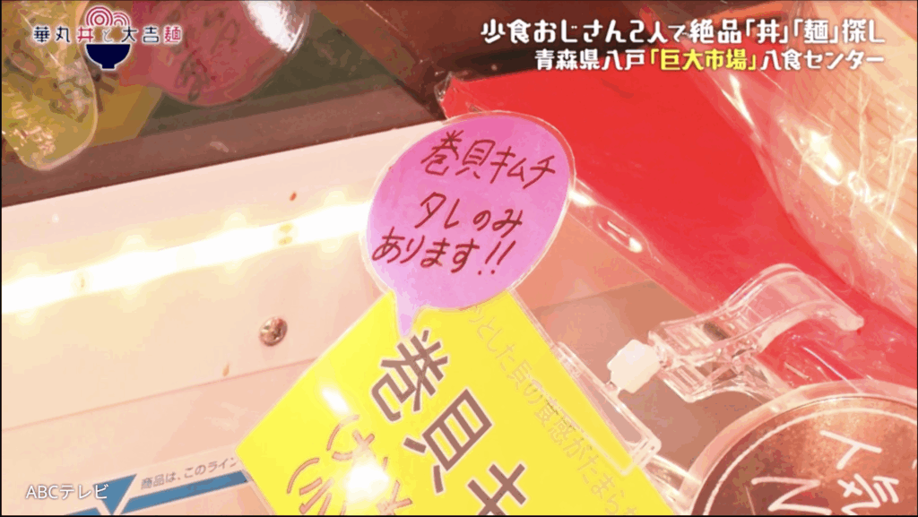 酒飲みの嗜好を見透かしたような「巻貝キムチのタレのみあります!!」という手書きポップを、華丸は「貝はいらない(笑)」、大吉は「タレのみ舐めたい(笑)」と受け止める。店員さんの「野菜炒めとかチャーハンとか(の味付けに使えます)」「意外とタレだけも人気ですね」というセールストークに、2人は「へええ〜!」「おもしろい!」と感心しきり。