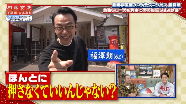 千葉県夷隅郡⼤多喜町を訪れた福澤は、街の名前にかけて「今日はみなさんにたくさんの喜びと幸せをお届けしたい!」と挨拶から完璧。お笑いコンビ・千鳥は、実⼒派アナウンサー・福澤の出演に喜び、ロケに対して“ちょっと待てぃボタン”を押す機会は皆無だろうと安心した。