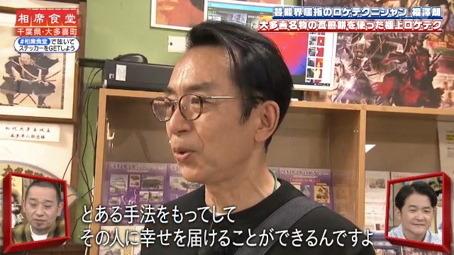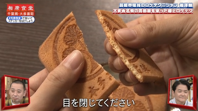 食リポも見事な福澤は、⼤多喜名物のかた~い⽡煎餅をかじって、「鶏卵の品の良さ。けして甘すぎない。硬さが絶妙にいいです」と的確にコメント。「とある手法をもってして、その人に幸せを届けることができるんですよ!」と自信満々な彼は、近くにいた女性店舗スタッフに「目を閉じてください」とささやき、なんと彼女の耳元で⽡煎餅の咀嚼音を鳴らし始めた!