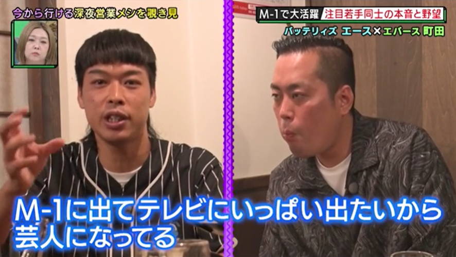 そもそもエースが芸人になりたかった理由は、「M-1に出てテレビにいっぱい出たいから」。夢がかなったため、エースは現在の自分が「ゴールしている」状態であり、「(M-1に)100%出んでもいい人間」と思っている。