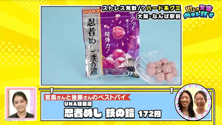 女性作業療法士のベストバイは、忍者めしの鉄の鎧。ハード系グミの忍者めしの中でも、鉄の鎧は「もっと固いです。顎が疲れます!」とのこと。彼女いわくストレス発散で食べるそうで、看護師6年目の友人も鉄の鎧がベストバイだとアピールしました!