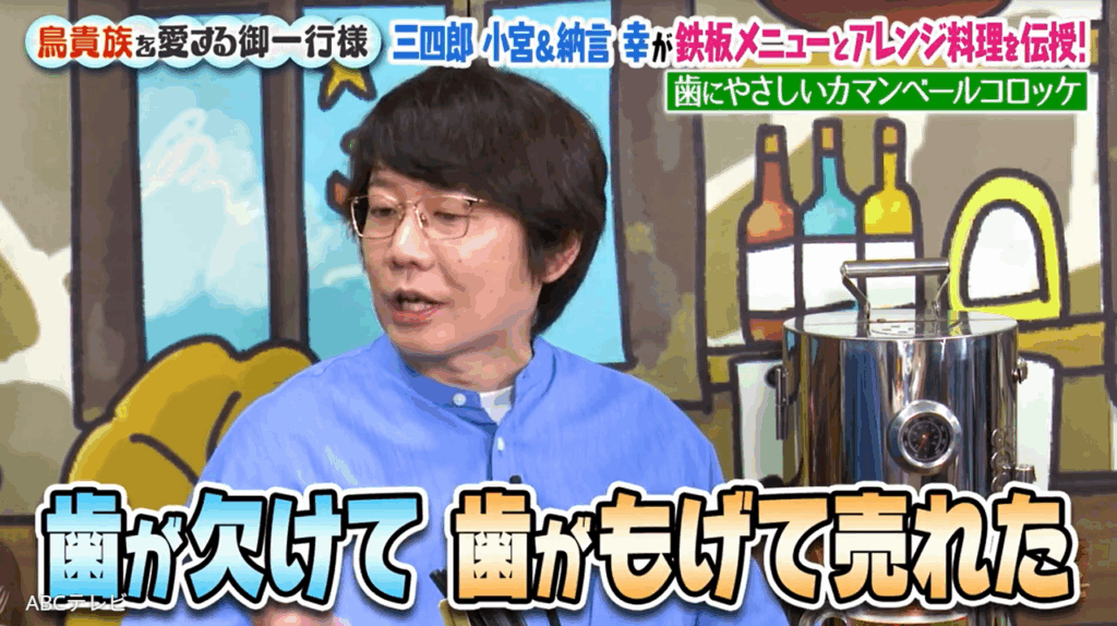 実は小宮は、20年も通うほど大手居酒屋チェーン・鳥貴族が大好き。彼のおすすめサイドメニューは、モチモチとろ~り食感のカマンベールコロッケだ。歯に優しいメニューということで、小宮は「僕は歯が欠けて歯がもげて売れた」「賞レースのチャンピオンでとかじゃない。歯もげで売れた」と語り、笑いを誘った。