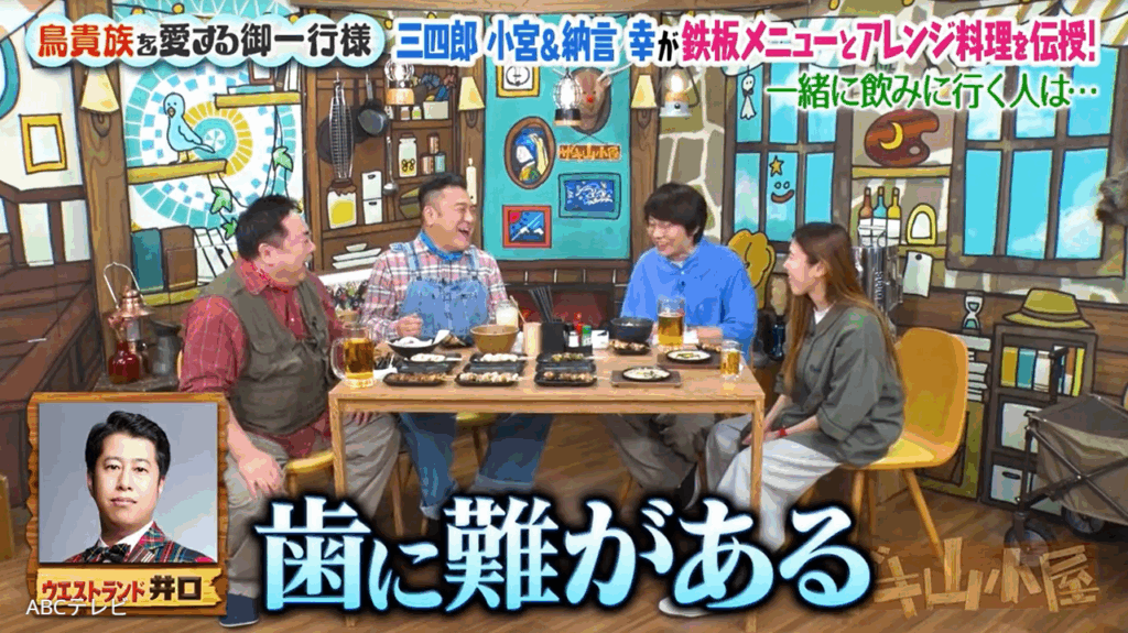 なお、小宮ら芸人たちの歯にまつわるトークは、バラエティ番組『ザキ山小屋』(ABCテレビ)10月10日深夜放送回で行われた。同放送回では、“鳥貴族をこよなく愛する御一行様”として、小宮が納言の薄幸とともに、鳥貴族の鉄板メニューとアレンジ料理を紹介した。