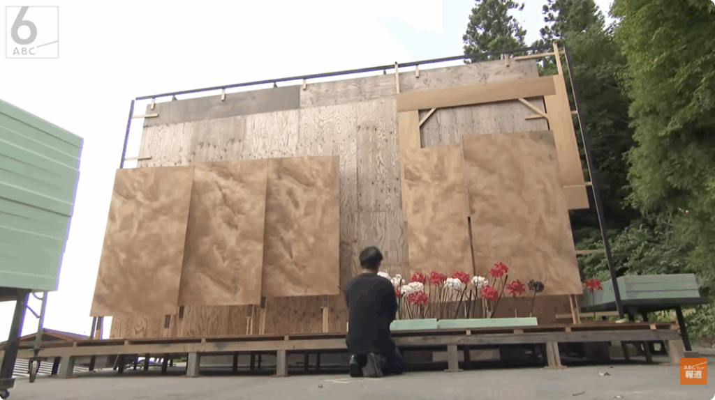 そして作業2日目、お披露目までいよいよ8時間です。ようやく見つかったイメージ通りの少女のマネキンの足下が、赤やオレンジの彼岸花で埋め尽くされていきます。打ち合わせの日の後、急ピッチで作った彼岸花は420本に。圧巻の美しさです。