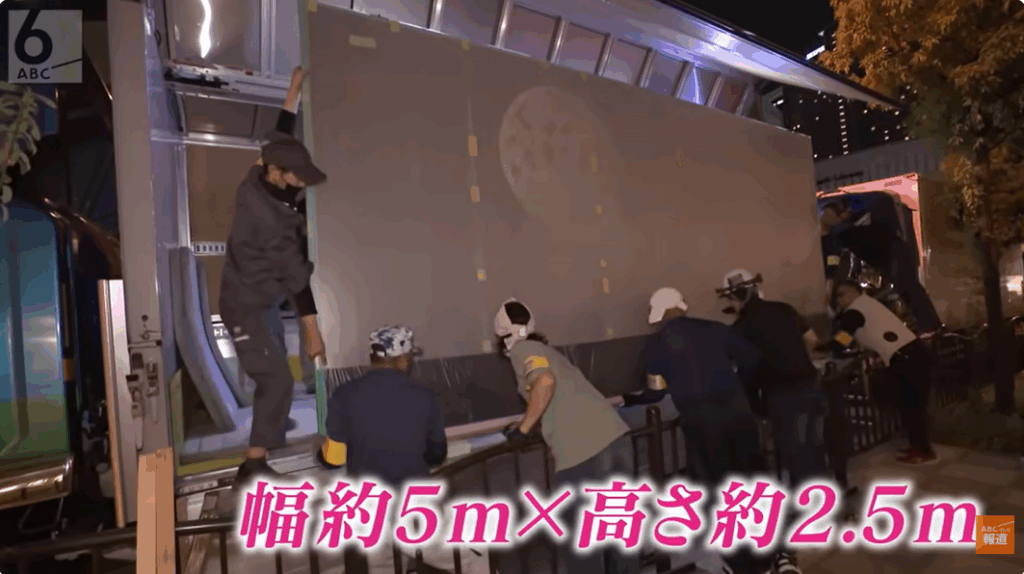 そして、お披露目まであと2日に迫った9月22日、阪急うめだ本店が閉店時間を迎えると、すぐさま搬入作業が始まりました。作品の中で最も大きいのが、少女が見上げる月がある背景。幅約5m、高さは約2.5mと巨大なうえ、相当な重量があります。