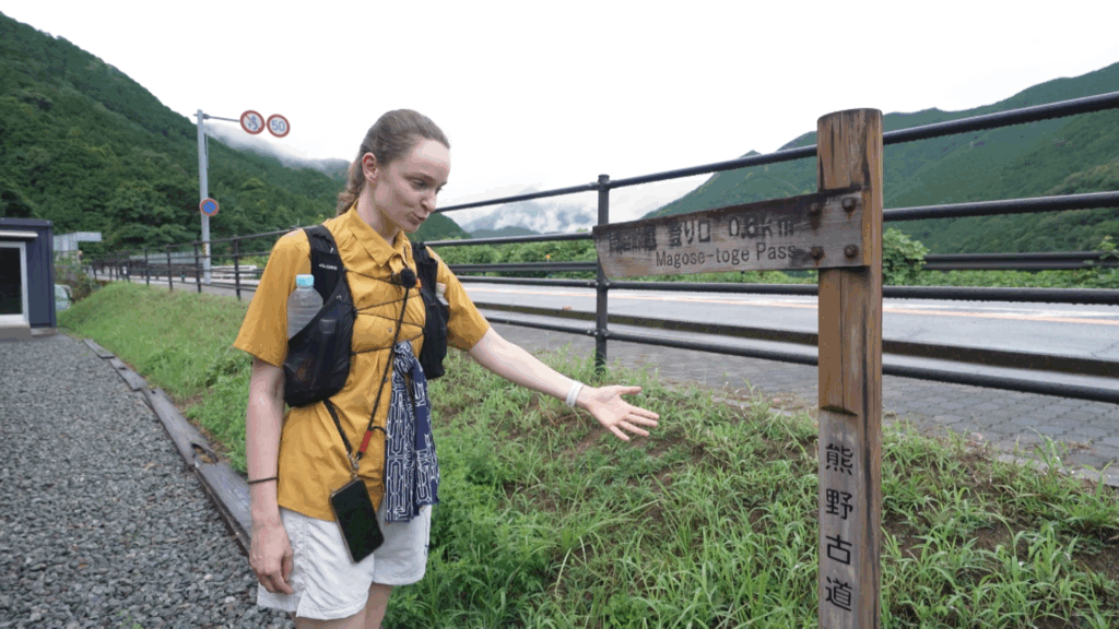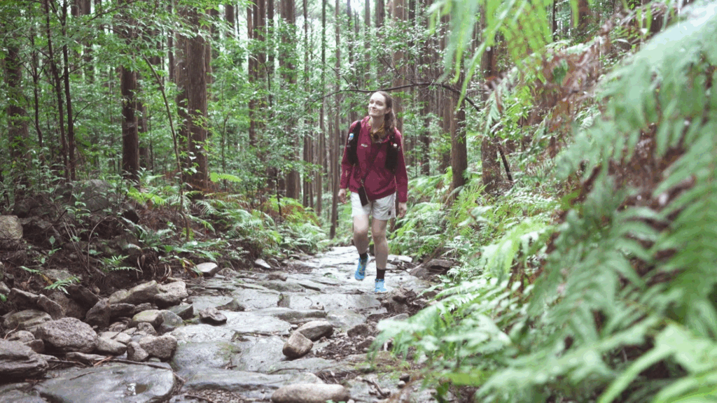 道中は生憎の雨。でもそこは山に慣れた安涼奈さん、「十分な準備をして行けば、むしろ雨の日にしか見られない景色もあるので楽しめますよ」とのこと。今回の登山は鷲下登山口から馬越峠を通って山頂に至るというルート。登り始めから峠までの道が『熊野古道・伊勢路』の一部として世界遺産に登録されています。今回の「伊勢路」は、伊勢神宮と熊野三山を結ぶ参詣道。背の高い檜の林の間を縫うように、江戸時代に整備されたとされる苔むした石畳の道が続き、幻想的な光景を楽しむことができます。