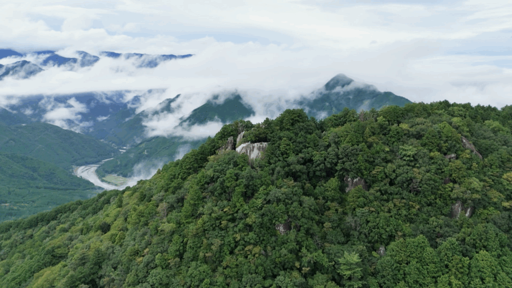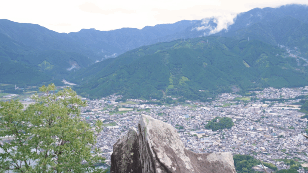 ここからは熊野古道から分かれていよいよ天狗倉山の山頂へと続く登山道へ入っていきます。足元はそれまでの石畳から、大きな岩がたくさん積み重なる森の急坂へと変化。少し息を切らせながら登ったその先には見上げるような巨岩が姿を現します。通称「天狗岩」。実は天狗倉山の山頂とされているのはこの岩の上で、そこへ続く高さ10mもの鉄の梯子が用意されています。「雨に濡れて滑りやすくなっているので慎重にいきますね」と、ついに登頂完了!広さ約20畳のこの岩の上からは、紀伊山地に連なる「おわしアルプス」の山々、尾鷲市の街並み、豊かな漁場でもある尾鷲湾などが一望できます。降り続いていた雨も上がって、待望の景色も堪能できた安涼奈さん、あとは「頂きメシ」が待っていますよ〜!