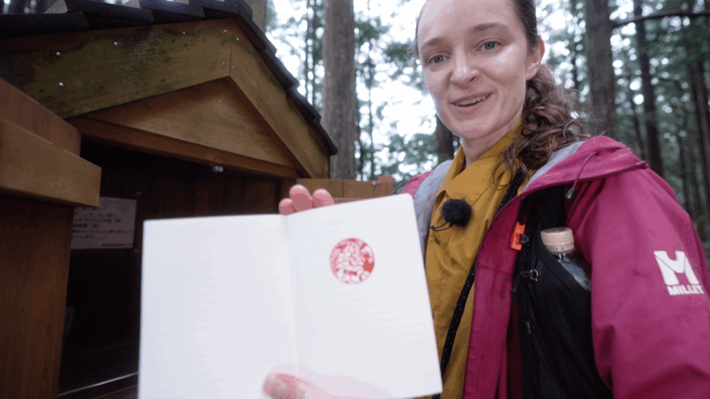 「雨の日には低い山にも雲がかかって、まるで日本の昔話に出てくる風景のようじゃないですか」と話す安涼奈さん。眺めを楽しみつつ先に進みます。やがて、明治時代までは茶屋があって旅人が一息入れていたという馬越峠に到着。「休憩といえば・・・団子ですよね!」と、ここでも日本の風情に詳しい安涼奈さんでした。この茶屋の跡地にはスタンプが設置されていて、古道の石畳がデザインされた記念のスタンプを押すことができます。