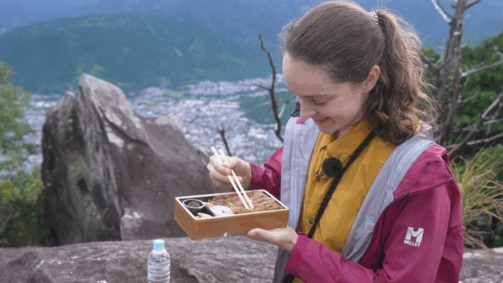 さて、お待ちかねの「頂きメシ」は地元で取れた沖ギスを使った蒲焼弁当。実は天狗倉山の麓にある尾鷲湾は豊かな漁場としても知られています。山から流れる綺麗な水、そしてその豊富な水が栄養分を運ぶことで海の環境が整えられているのだそう。山に登って海の幸を堪能する。これも日本の低山の楽しみですよね、安涼奈さん。お疲れ様でした!