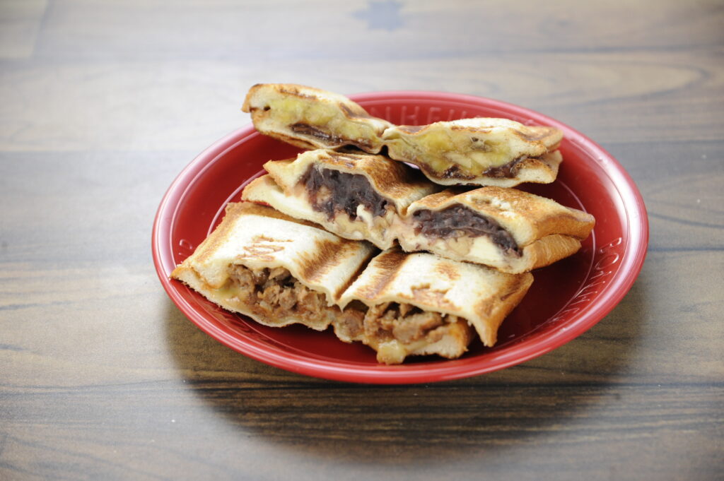 しかし、いつも作るのは「焼かない」バージョンで、ホットサンドは初めてだとか。ホットサンドメーカーに食パンがジャストサイズで入ることに「おぉ、ちょうど!」といたく感動したり、こんがりとついた焼き色に「オッケーー!」と興奮したりと、大騒ぎしているいうちにおいしそうな3つのホットサンドが焼き上がった。