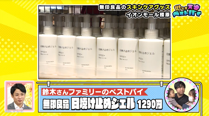 夫婦は「スキンケアグッズは全部無印良品」で揃えており、中でも家族で愛用している日焼け止めジェルがベストバイ。お子さんは皮膚が弱いそうですが、「無印の日焼け止めが肌に合っているから、結構湿疹が出にくい」とのこと。