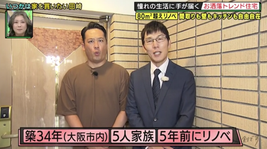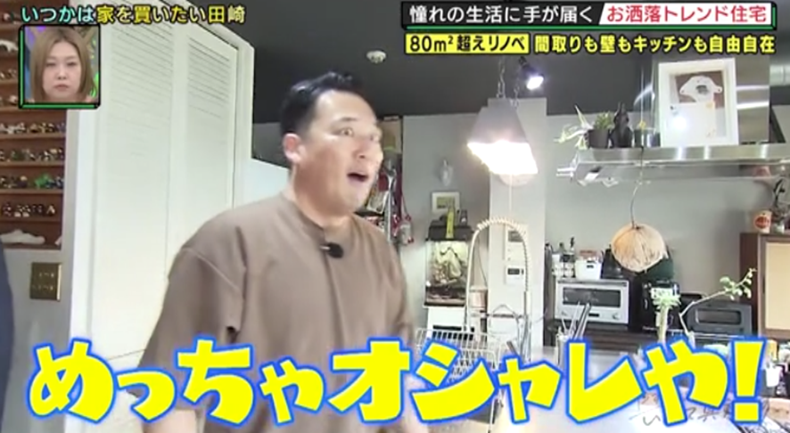1軒目は“80平米超のリノベマンション”。80平米超の新築マンションが都心で少なくなりつつあるなか、広くて格安、自分好みにリノベーションできる中古マンションの人気が高まっているという。ゴエが田崎を案内するのは、大阪市内にある築34年のマンション。もとはごく普通の間取りだったが、5年前、アメリカンスタイルのオシャレな空間に大改造! 土間タイプの玄関の奥には、自転車や夫のコレクションなどが並ぶ趣味のお部屋が。19畳のLDKの中には窓で仕切られた小さな書斎があり、「秘密基地感がある」「これ、めっちゃいい!」と田崎は大興奮で…。そんななか、リノベだからこそ実現できた間取りの工夫を発見! 「勉強になりますね〜」と田崎をうならせた、家事がグンとラクになる超便利な間取りとは?