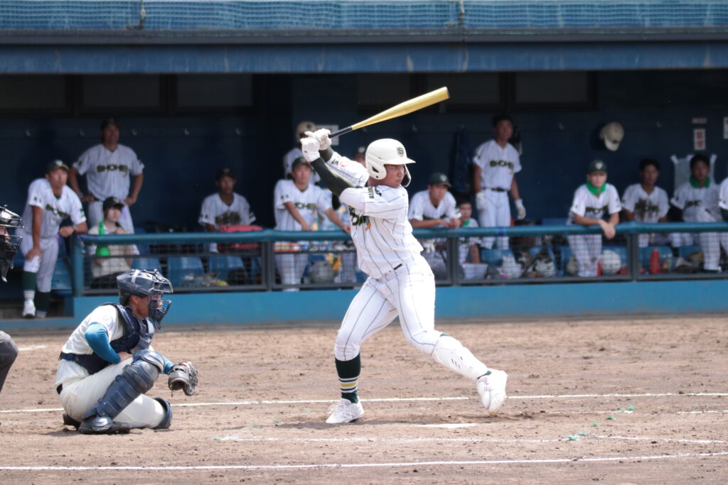 そんな印象が大きく変わったのは3年春の地区予選だ。この日は第1打席でいきなり死球を受けるなど相手バッテリーのマークも厳しかったが、第2打席で低めのボールをしっかりとらえてレフト前に運ぶと、第3打席では凡打となったもののセカンドへ強烈な当たりを放ち、第4打席でもボールをしっかり見極めて四球を選んでいる。下級生の頃と変わったのはタイミングの取り方だ。以前はどうしても反動をつけようとする動きが大きかったが、体が大きくなって余裕が出たこともあってか、現在では大きく構えてわずかにバットを引くだけであり、長くボールを見られるようになった。またスイング自体も上半身の力だけでなく、下半身もしっかり使ってフルスイングできており、ヘッドスピードとインパクトの強さは高校生では間違いなくトップクラスだ。
