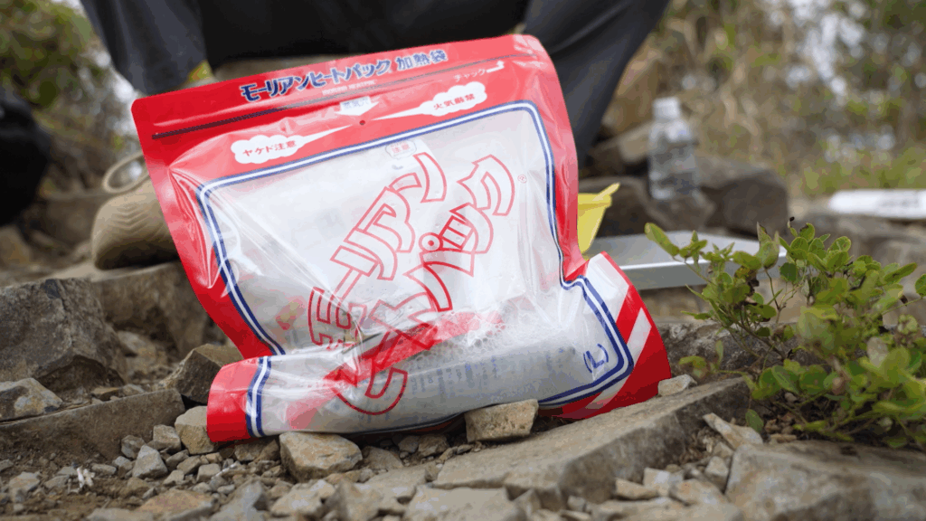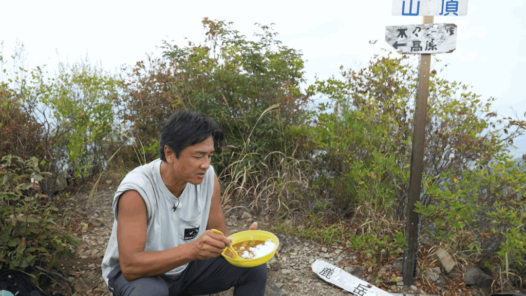 さて、お待ちかねの頂きメシ、原田さんが用意してきたのは、群馬のブランド豚を使った「下仁田ミートポークカレー」。今回は火を使わずに加熱調理ができる「モーリアンヒートパック」という便利な道具を使ってレトルトを温めていきます。手順は至って簡単、温めたい食材と発熱剤を入れた袋に水を入れて密閉、あとは待つだけ。湯気が上がって15分で加熱完了。山頂で熱々のカレーライスが食べられる贅沢な時間に大満足の原田さん、お疲れ様でした。