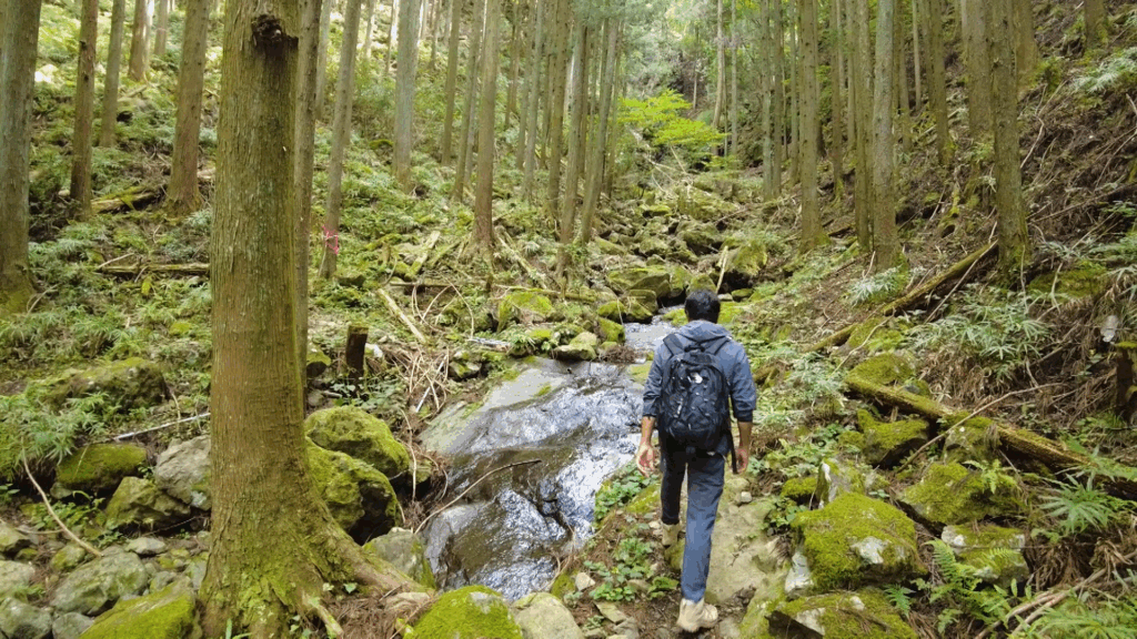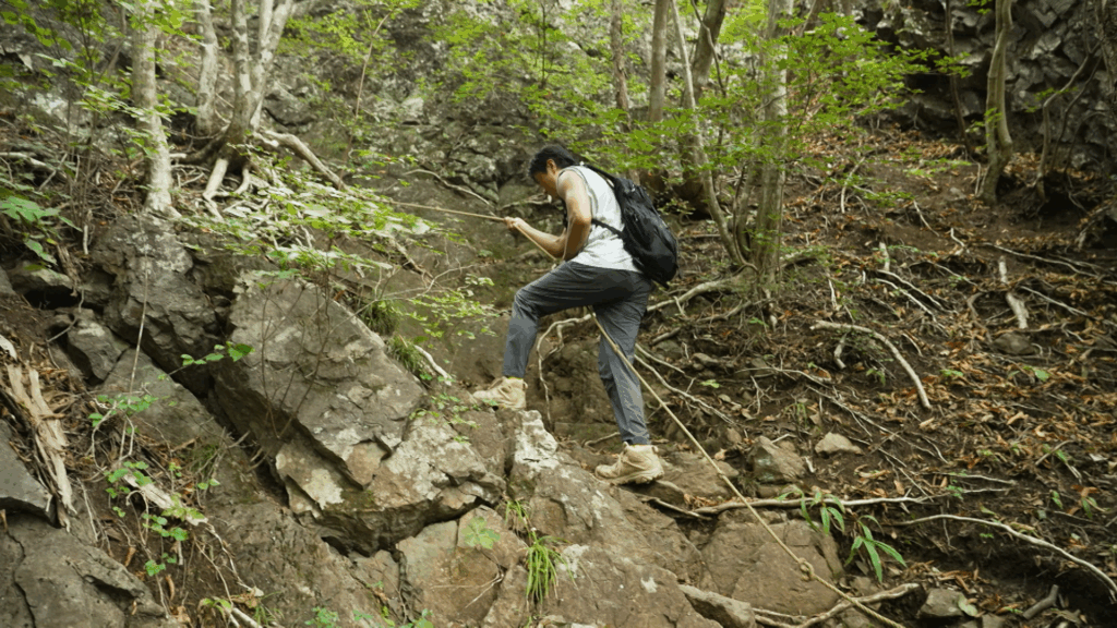 登山口駐車場は標高約435m。山頂まではおよそ3時間、標高差580mは低山の部類に入るものの、傾斜はかなり急。深い森林のいたるところに火山性の岩石が転がっている山道はアドベンチャー感満載!重い機材を担いで登る撮影隊の顔が緊張で曇り気味なのとは裏腹に、のっけからワクワク感が体から溢れ出ている原田さん。ザクザクと山道を進んで行きます。