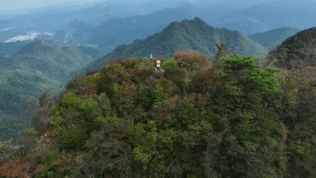 愚痴をこぼし始める撮影チームを気遣いながら登りきった原田さん、山頂の景色にしばし絶句。鹿岳・ニノ岳の山頂、標高1015m。目の前にはつい先ほど制覇した一ノ岳、周囲には上州の山々が360°遮るものもなく見渡すことができます。