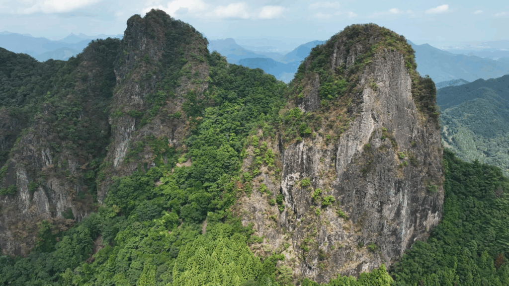 落石に注意しながらさらに進むと最初の目的地、一ノ岳に到着です。鹿岳の2つある角のうちの一つの先端、標高985mの山頂です。谷を挟んで向かい側には今回のゴール、二ノ岳の山頂も見えます。元々このあたり一帯は、火山活動によって隆起した土地が数百万年の風雨によって侵食され、岩石の硬い部分だけが山となって残ったという地形。そのため山頂付近が切り立った岩峰となっていることが多いのだとか。その二ノ岳に向かって「ヤッホー!」と原田さん。