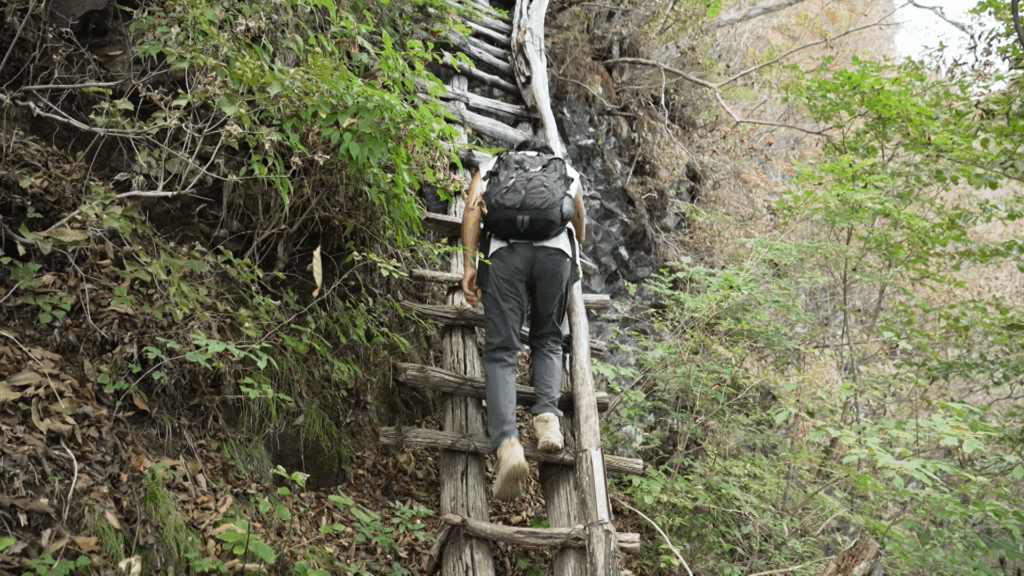 一ノ岳で絶景を前にしばし休憩をとって、いよいよ最終ゴールの二ノ岳に向かって登山再開。鹿岳の対になった二つの角の間を一旦下り、改めて急な登り坂を進みます。一人ずつしか登ることができない狭い急梯子を登り、最後の難所の鎖場へ。